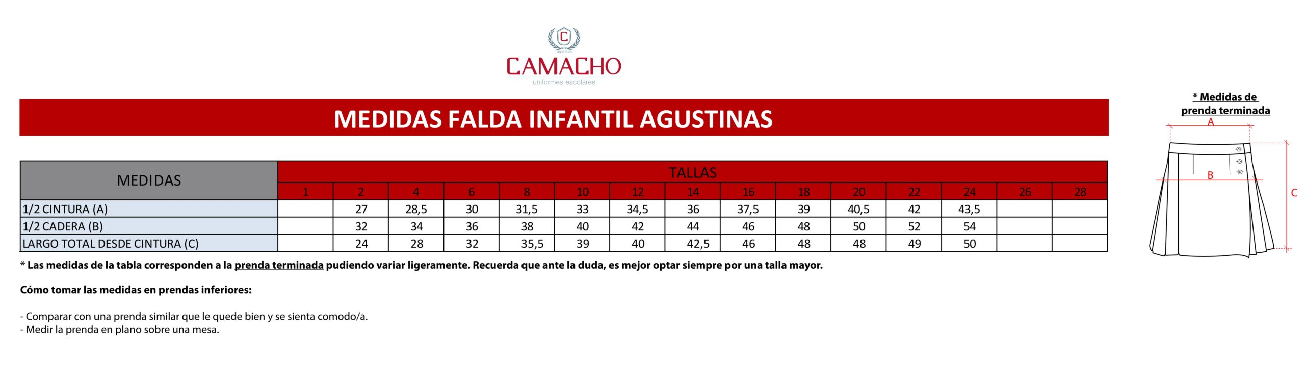 Falda con tablón delantero y plisado en su parte posterior del uniforme del Colegio Santa María de Gracia. Modelo homologado, fabricado por la marca Camacho uniformes escolares. Fabricado en sarga de cuadros Poliéster/Lana de alta calidad, resistente y duradero. La falda de tablas incorpora tirantes hasta la talla 8. A partir de esta talla el modelo no los incluye.