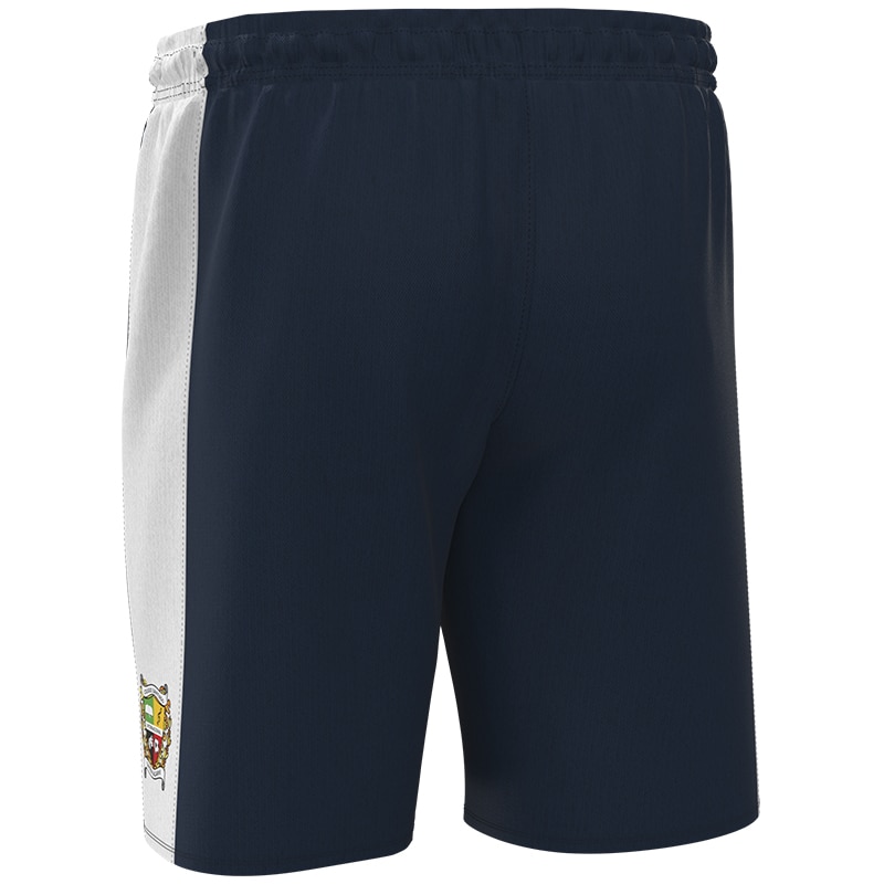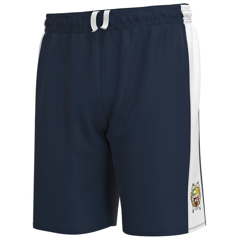 Pantalón corto de deporte, perteneciente al uniforme homologado del Colegio Santiago de Tavira. Fabricado bajo la garantía de Camacho uniformes. realizado en tejido de acetato mate sin perchar de gran calidad con certificado *Oekotex. Color marino base con franja blanca a ambos laterales  incorporando, el derecho, el logotipo del colegio  con técnica de sublimación.. Costuras con refuerzo especial para aumentar la durabilidad de la prenda. Cintura elástica ajustable con cordón interior, según normativa en seguridad para ropa infantil.