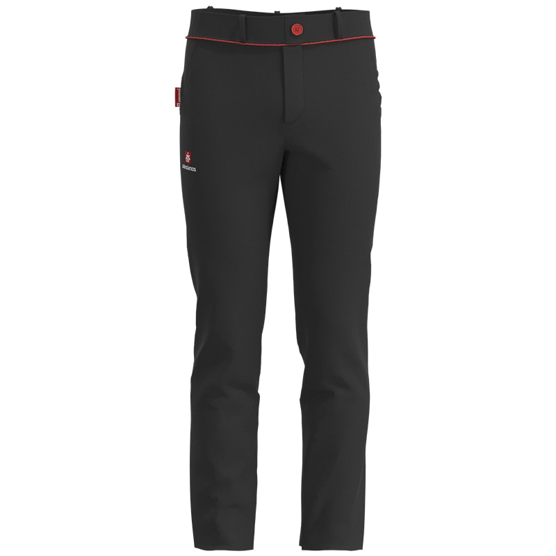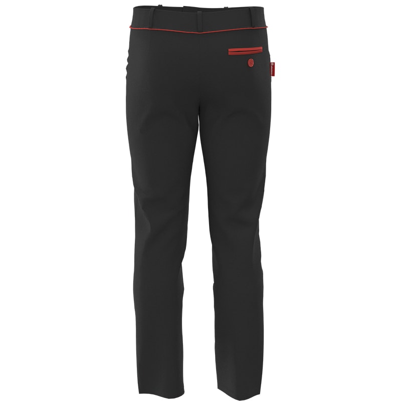 En la parte trasera incorpora bolsillo con doble vivo en rojo corporativo y botón personalizados con el logotipo de los colegios Salesianos. Detalle de vivo cordón en rojo corporativo en todo el contorno de la cintura.
